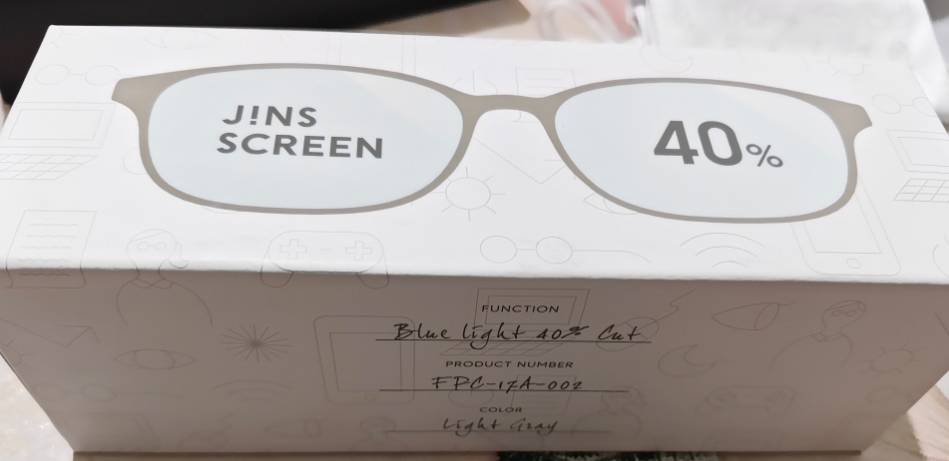 JINS睛姿防蓝光眼镜,40%蓝光阻隔,适合成人使用。专柜购置,几乎全新,包装完好。镜框款式为全框,颜色为浅灰色。无度数,适合长时间使用电脑和平板的朋友。